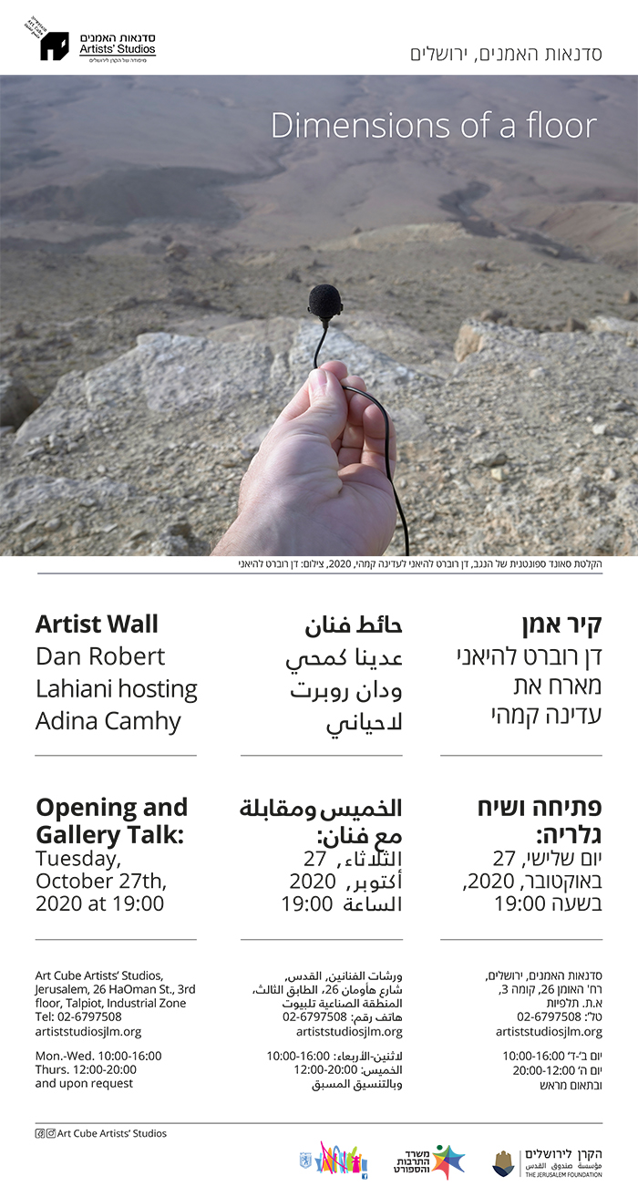Dan Robert Lahiani hosts an exhibition that shows fragments of our work in progress aswell as two independent works in the two person exhibition “dimensions of a floor” as part of artist wall / manofim, Jerusalem.
