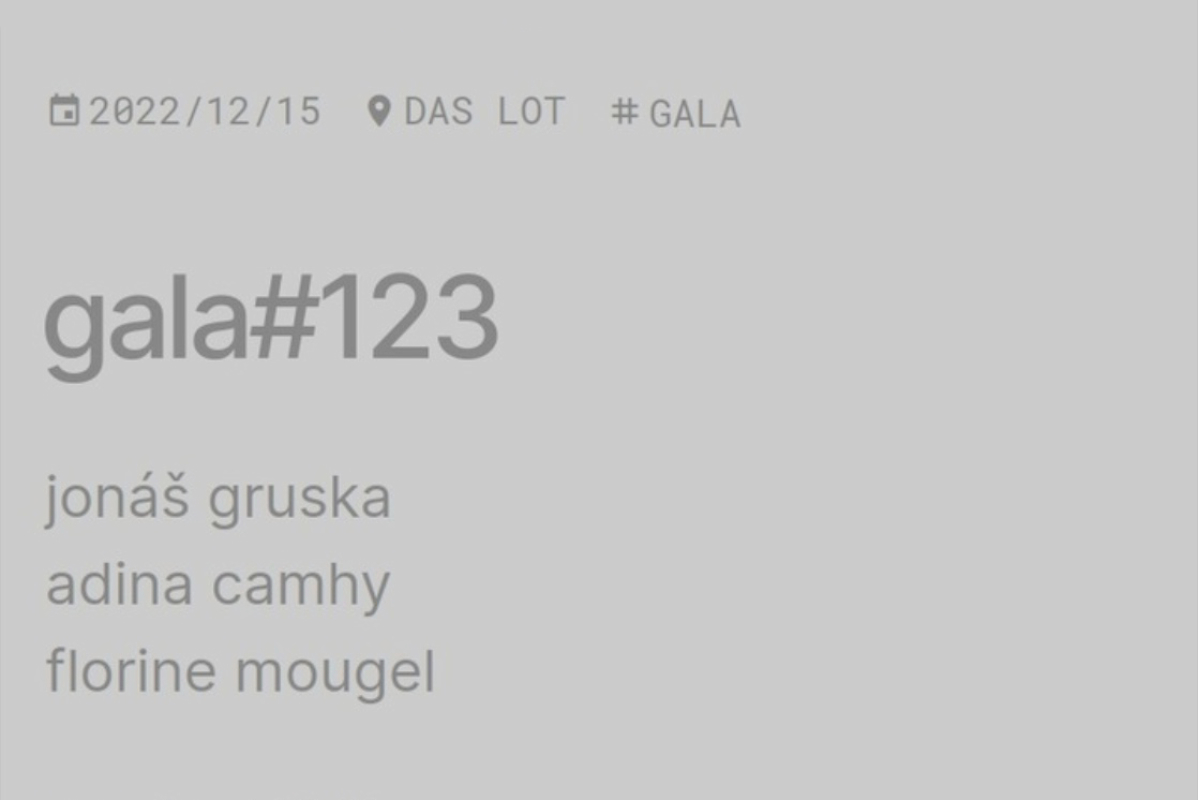 Program: Jonáš Gruska Adina Camhy Florine Mougel open doors: 20:00program start: 20:30 Das Lot, Absberggasse 31, 1100 Vienna velak is a non-profit organisation and platform for artists who work in fields of experimental music and sound/art. Velakgala#123 (esel.at)